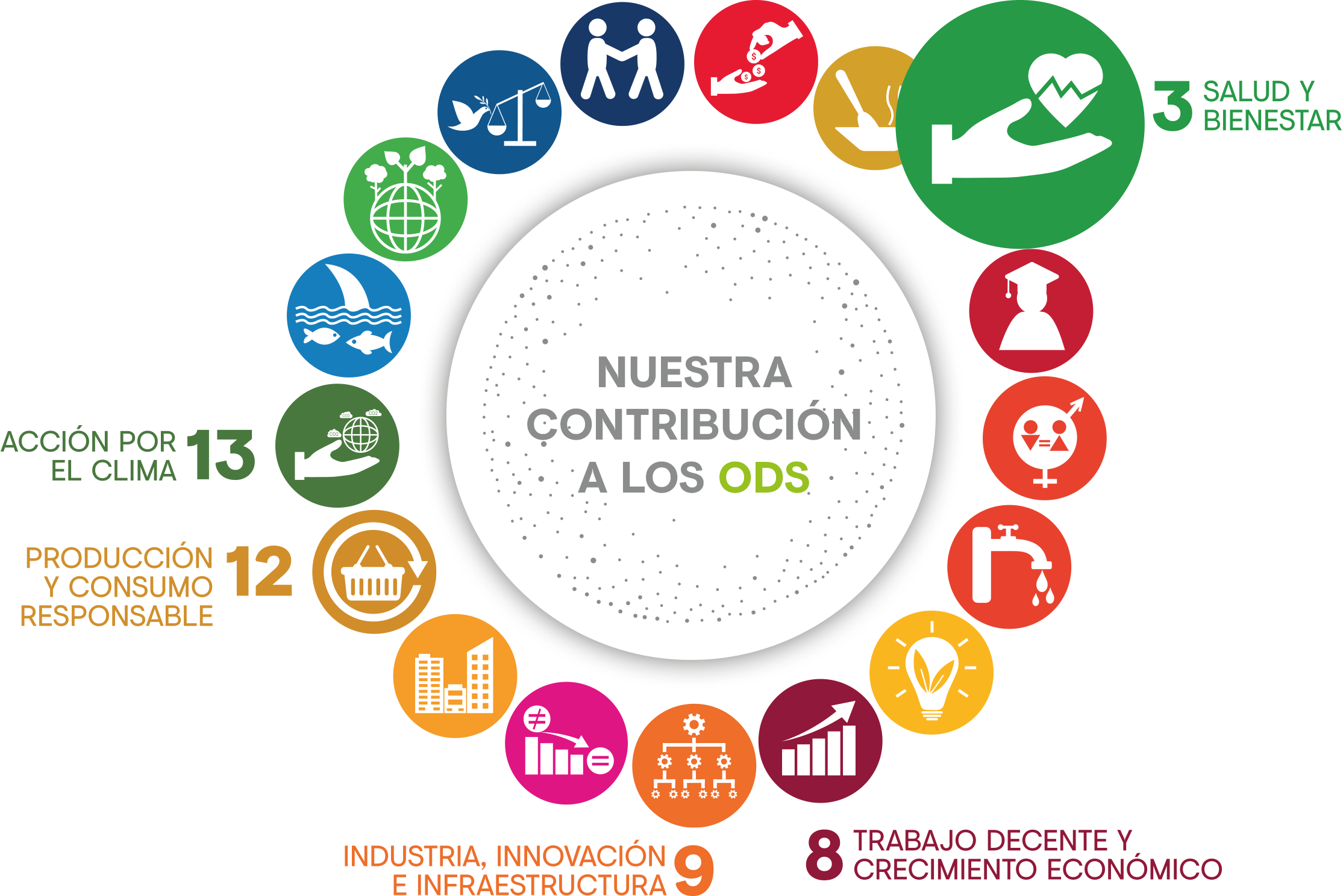 Asimismo, como organización socialmente responsable, nos comprometemos a apoyar los Objetivos de Desarrollo Sostenible de las Naciones Unidas y, especialmente, contribuimos de manera directa a cinco de ellos: ODS 3 - Salud y el Bienestar, ODS 8 - Trabajo Decente y Crecimiento Económico, ODS 9 - Industria, Innovación e Infraestructura: ODS 12 - Producción y Consumo Responsable; y ODS 13 - Acción por el Clima.